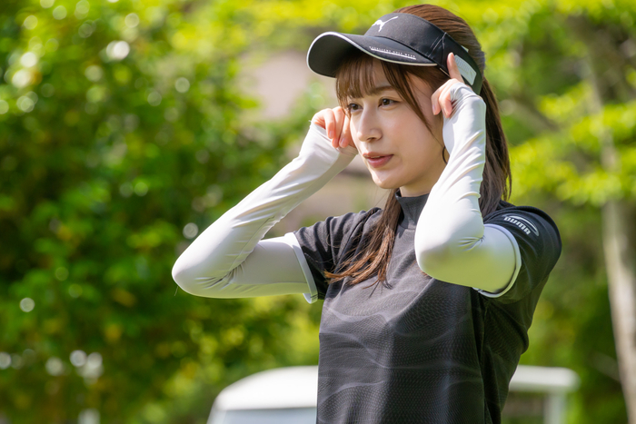 黒を基調としたウエアに身を包んだ雪平さん。名前の通りの白い肌は、日焼け対策で露出は控えめ。普段の日焼け対策トークなどで出演者と盛り上がる場面も。