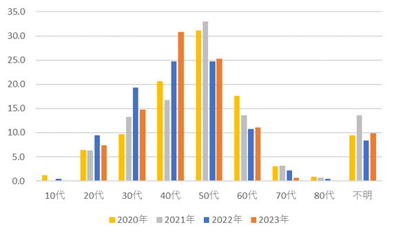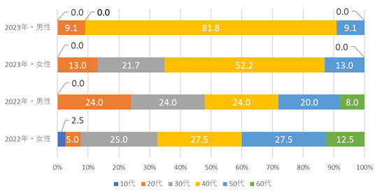 相談全体の男女比は女性が6割~7割弱で推移しています。年代別ではこの4年間の推移で比較すると、以前は50代がもっとも多かったものの、徐々に40代へシフトして今年はついに逆転しました。