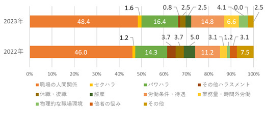 項目別で最も割合が高かった「職場の悩み」の項目では「パワハラ」が2.1%増、「労働条件・待遇」が3.6%増となりました。
