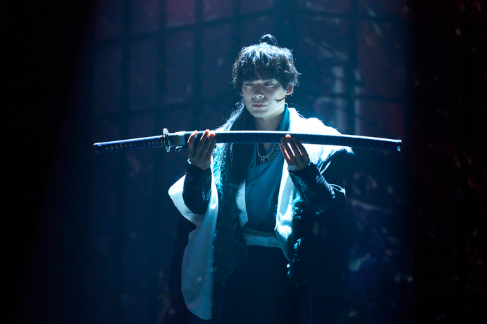 この日は、物語全貌を彷彿とさせるオープニングシーン、さらに八人の剣士たちが殺陣を繰り広げるシーンが公開された。日本刀を中心に、さまざまな武具による迫力ある圧倒的な殺陣が目を引く。ステージいっぱいに設置された巨大なセットが、シーンごとに配置や形を変え、幻想的な空間を作り上げていた。