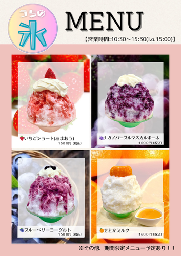当店のこだわりは、「国産フルーツ」と「天然氷」。旬の素材を活かしたメニューは、フレッシュで贅沢な味わいが自慢です。素材の良さを最大限に引き出したかき氷を、ぜひご堪能ください。