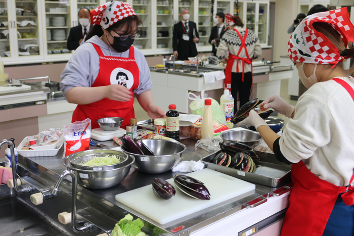 今回のコンテストでは、1次の書類選考を通過した本学の学生4チームが、茄子や、えび芋、小松菜など、南河内で採れた野菜を使ったレシピを考案しました。