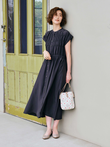 身頃にシャーリングを施して華やかに仕上げたフレンチスリーブのシャツワンピース。ウエスト位置をやや高めに設定し、すっきりシェイプされたシルエットにしたことで、歩いた時の揺れ感が優雅で上品な一着。 防水機能が施されたやわここちパンプスとも好相性のアイテムです。