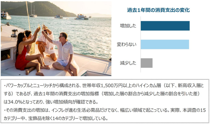 会員制マーケットリサーチサービスを提供している、株式会社SVPジャパン(本社:東京都中央区、代表取締役社長:橋本 雅、以下「SVPジャパン」)は、「現代の消費者行動に関する調査分析」と題して、主要世代の消費者行動のトレンドを把握することを目的に、年2回の定点観測を実施。今回は、新高収入層(パワーカップル・ニューリッチ)を対象とした調査結果をレポートにまとめた。