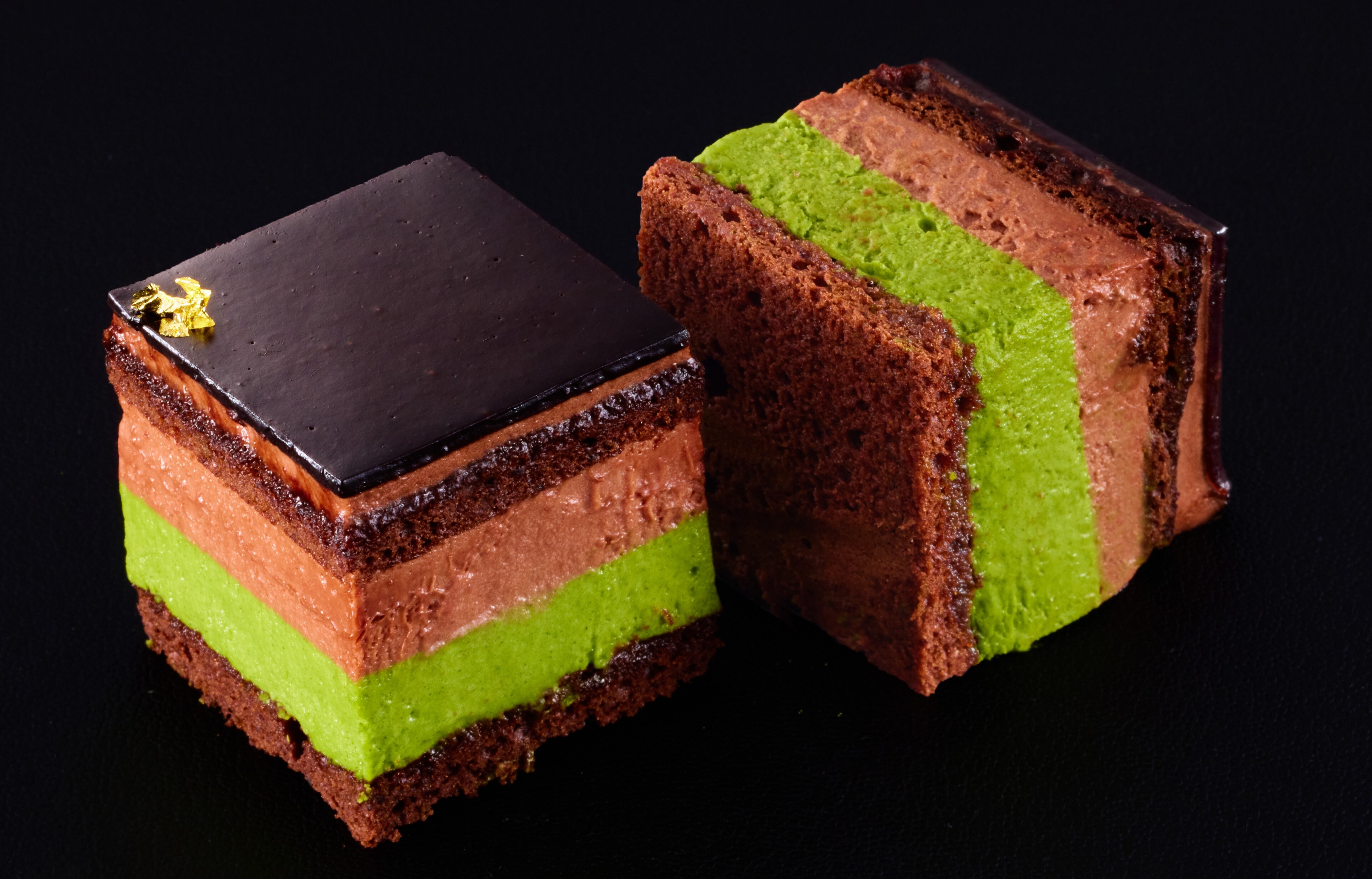 ダークチョコクリームの中にほのかな酸味のミュール(ブラックベリー)を入れ、 濃厚ながらも軽やかな味わいに仕立てた抹茶チョコレートケーキです。一層一層丁寧に重ねたムースの表面を艶やかなチョコレートのグラサージュが彩ります。