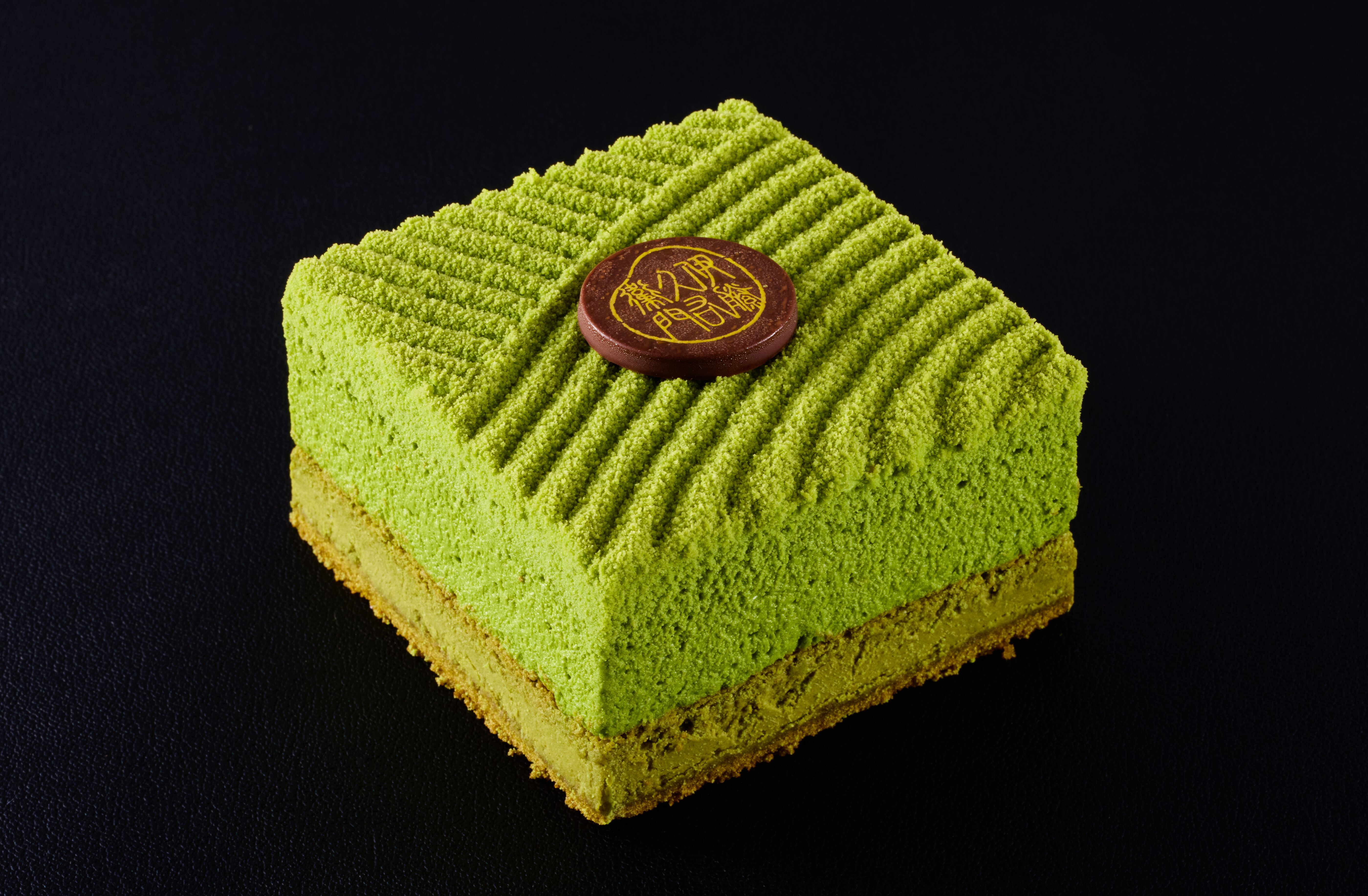 「お濃茶の味わいを伝えられるケーキを」との思いから生まれたチーズケーキです。上段はレア、下段がベイクドと2 層のチーズケーキに仕立てました。上面には薄くチョコレートを吹き付け、初夏の茶園をイメージした色鮮やかなデザインに仕上げています。
