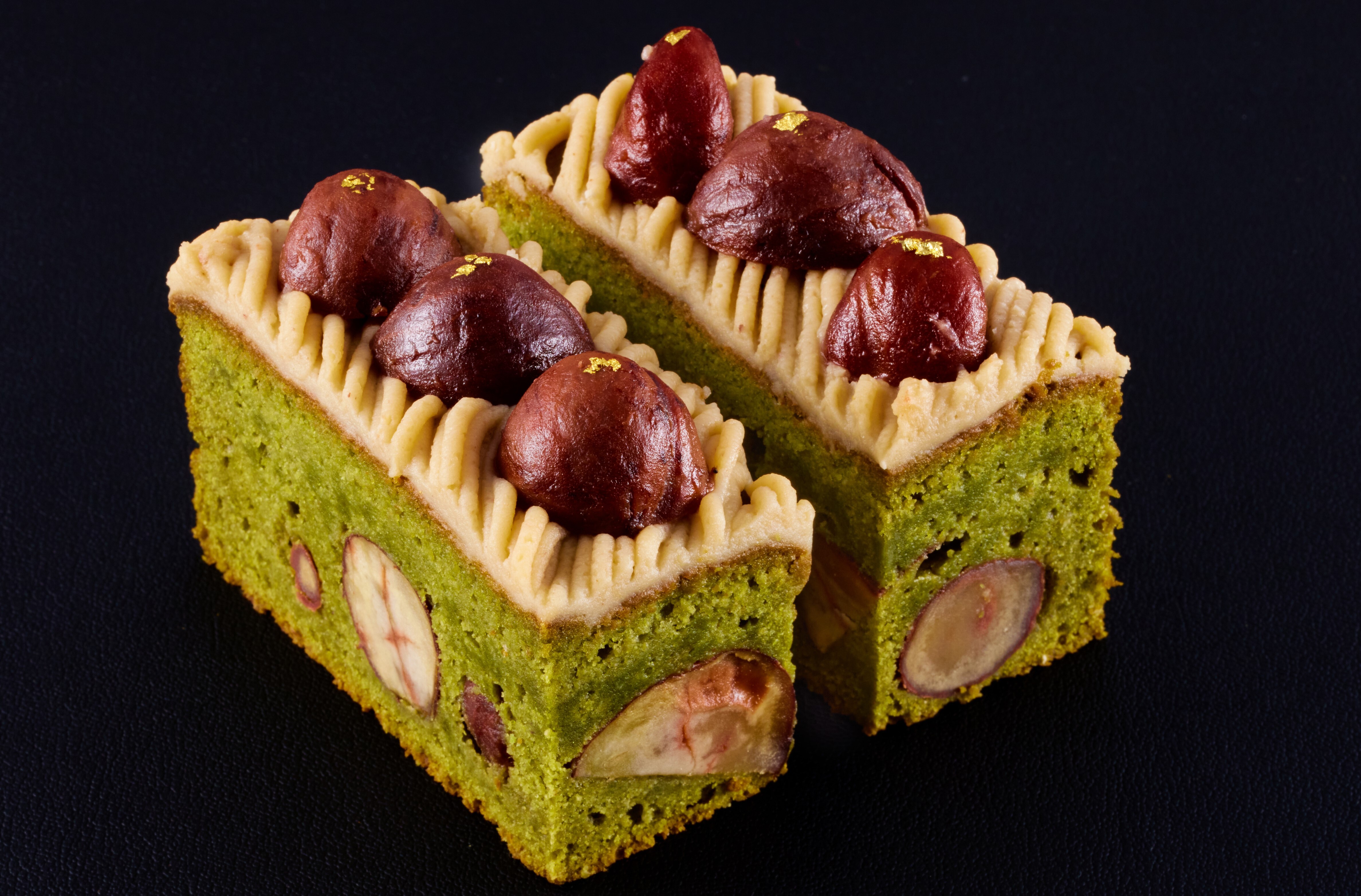 渋皮栗を贅沢に使用した宇治抹茶のパウンドケーキです。焼き上げる際にブランデーをしみこませ、一晩寝かせて味をなじませました。栗クリームを絞りモンブラン風に仕上げています。