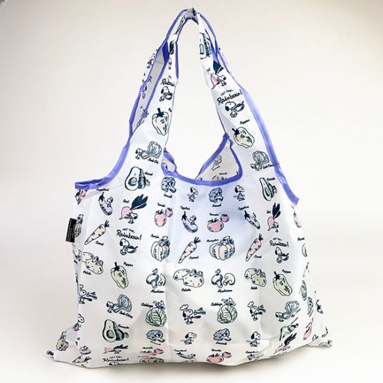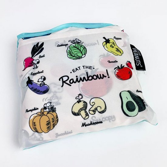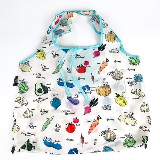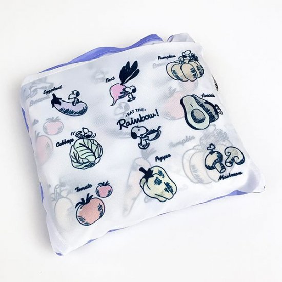 ニンジンやトマト、ジャガイモやキャベツなど、さまざまな野菜がチラシ柄になっています。よく見ると、野菜に乗っかったスヌーピーやコック帽姿のウッドストックも♪楽しくなるデザインです。