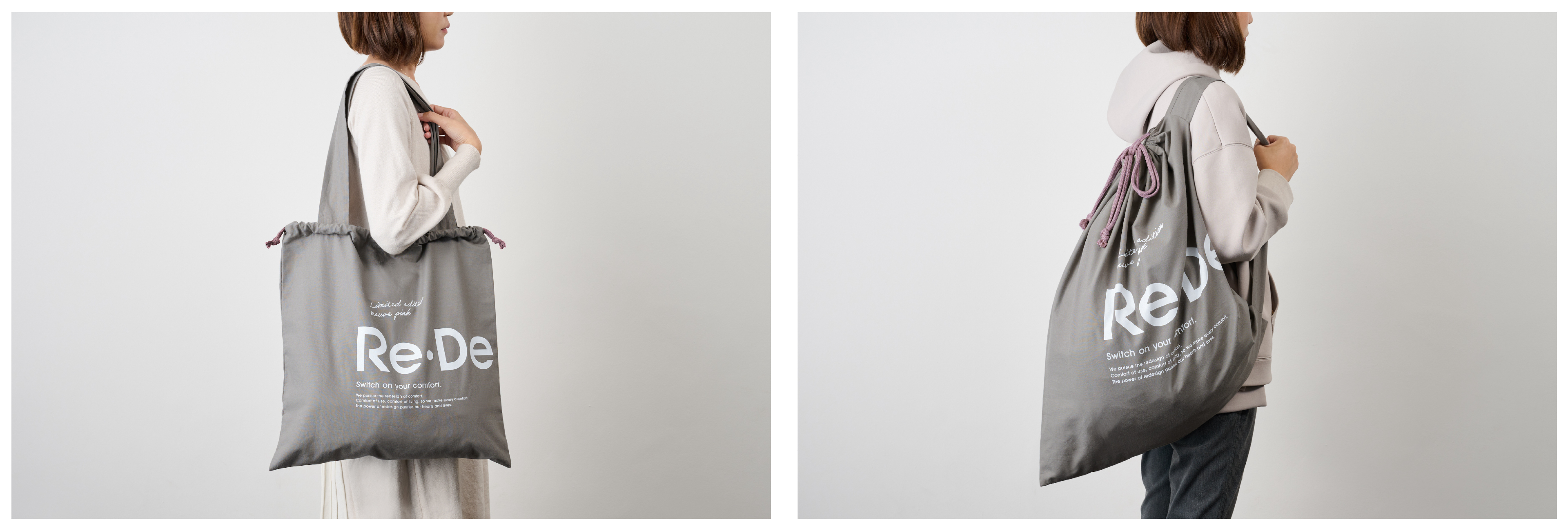 この度発売する「MAUVE PINK」専用のラッピングバッグは、ギフトラッピングとして、製品が届いた時のワクワク感を演出しながら、ランドリーバッグやエコバッグとして、包装の役割を終えた後も使い続けていただけるアイテムとして制作しました。布地のカラーや絞りの紐は、「MAUVE PINK」のカラーに合わせたデザインとなっており、製品ごとのサイズに合わせ、それぞれ違ったスタイルでバッグ使用が楽しめる肩掛け紐が付いています。今までのギフト包装をリデザインした、もらって嬉しく、地球にも優しい、Re・Deならではのアイテムです。