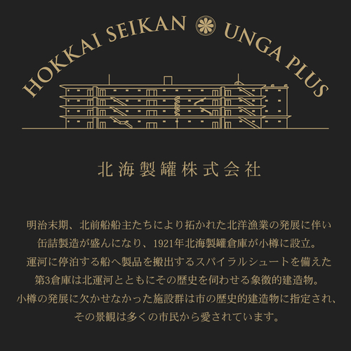 明治末期、北前船船主たちにより拓かれた北洋漁業の発展に伴い缶詰製造が盛んになり、1921年北海製罐倉庫が小樽に設立。運河に停泊する船へ製品を搬出するスパイラルシュートを備えた第3倉庫は北運河とともにその歴史を伺わせる象徴的建造物。小樽の発展に欠かせなかった施設群は市の歴史的建造物に指定され、その景観は多くの市民から愛されています。