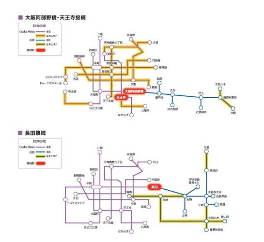 大阪難波駅、近鉄日本橋駅、大阪上本町駅、大阪阿部野橋駅、長田駅でOsaka Metroと連絡するICOCA連絡定期券のご利用エリアを近鉄線の奈良エリアを中心に大幅に拡大するとともに、Osaka Metro線内でのエリアや乗車ルートも拡大します。
