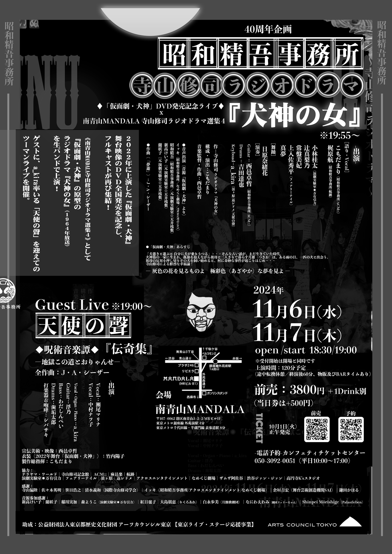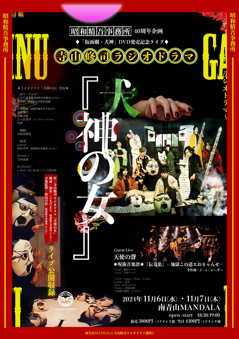 昭和精吾事務所主催、寺山修司ラジオドラマ『犬神の女』が2024年11月6日 (水) 〜 2024年11月7日 (木)に南青山MANDALA(東京都 港区 南青山 3丁目2−2 南青山MRビル 1F)にて上演されます。2022年公演の全キャストが再集結し、公開収録に挑む 舞台『仮面劇・犬神』DVDの全国発売(2025年1月を予定)に先駆けた記念企画で、戯曲の原型であるラジオドラマ『犬神の女』(1964年放送)の上演となります。