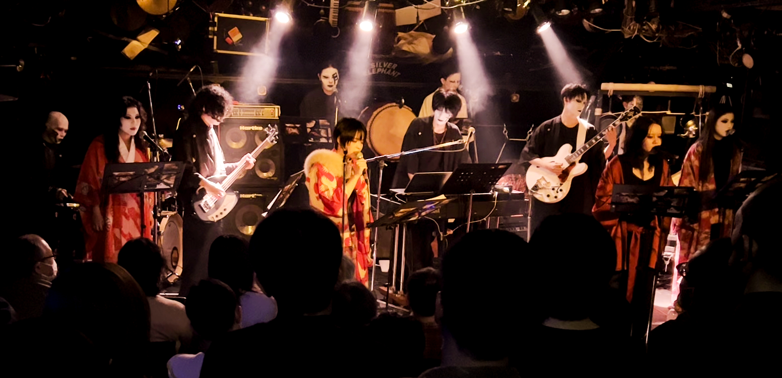 ゲストライブは、a_kira率いる「天使乃聲」。天井桟敷の劇中歌や、当時のコンサートで歌われたJ・A・シ ーザー曲を演奏します。中でも1970年代に新⾼けい⼦によって⼀度だけ歌われた幻の名曲を再現するほか、演奏曲⽇替りでライブを⾏います。 終演後も60分間、BARタイム続⾏するので、キャストとの交流 や⽝神の⼥コラボカクテル『⾚い⽉』や、この⽇のために撮り下ろした舞台『仮⾯劇・⽝神』⾐装によるキャストブロマイド販売など、余韻を味わうお楽しみも⽤意されています。