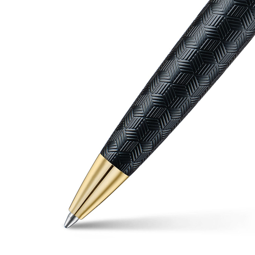 アート、建築、壁画などに見られる幾何学的な装飾にインスパイアされた「エングレーブド」がシェーファーの定番シリーズに加わりました。マットブラックの軸に特徴的なキューブパターンが彫刻された堂々とした佇まいの新作。光沢のあるクロームメッキのキャップと、ゴールドカラーのPVD加工が施されたステンレススチールのペン先が、ボディに刻まれた独特な模様を際立たせています。