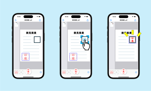 タップした位置周辺のPDF内の枠を自動で認識して、枠内にサイズ調整した印鑑を押印できます。印鑑を移動、拡大縮小する手間が省けます。