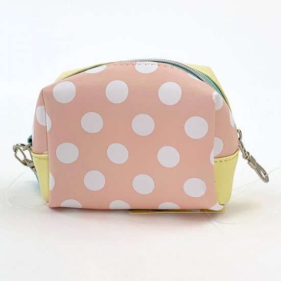 うしろはサーモンピンクのドットデザイン。サイズは10cm×8cm、お出かけ用の小さめバッグとも相性抜群です♪