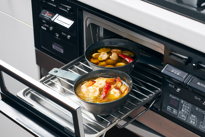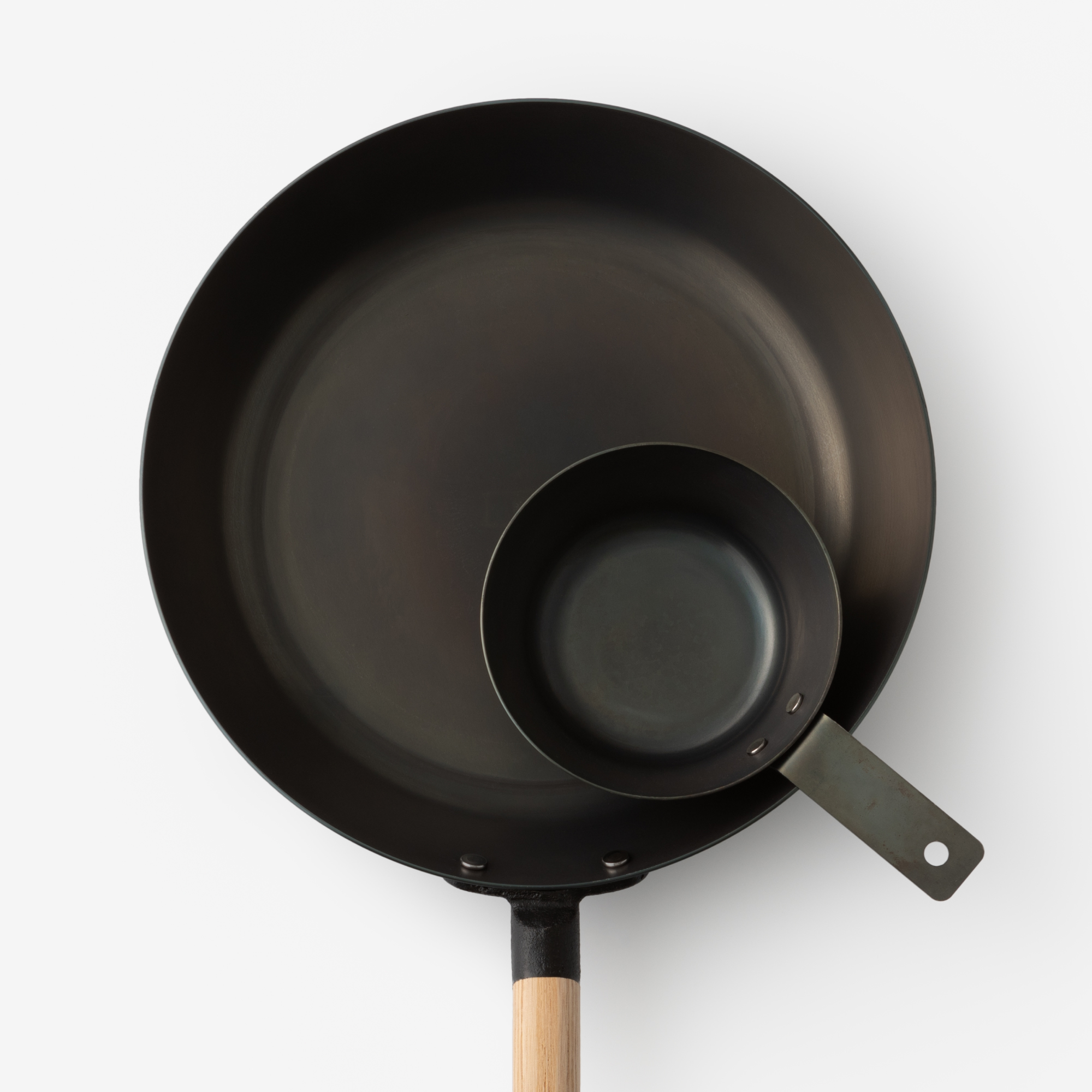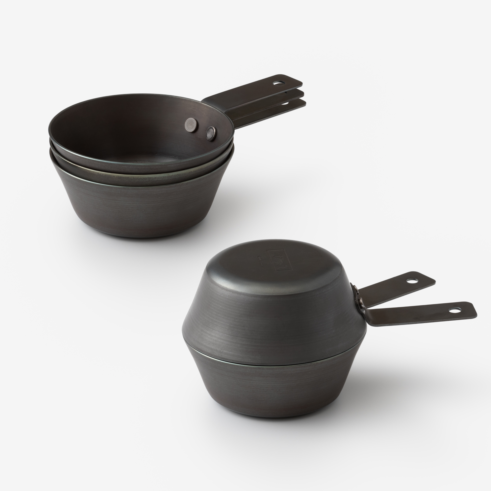 鉄の熱伝導を活かして鉄フライパンと鉄カップを重ねて同時に調理が可能。