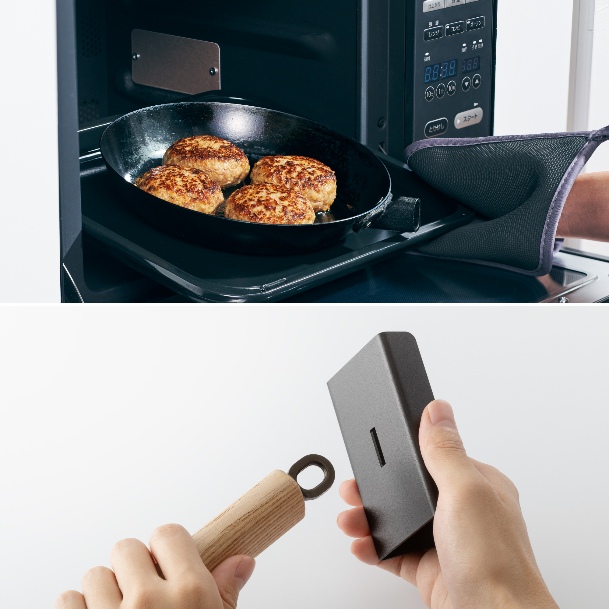 天然木のハンドルは取り外しができIHやガス火の調理に加えてオーブンでの調理にも対応可能。また付属のスタンドはドライバーのようにネジを回すことができ、調理中でもハンドルの着脱がしやすくなっています。