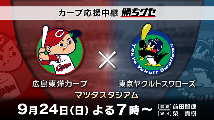 【カープ応援中継 勝ちグセ】CS進出にむけ2位を死守『ヤクルト戦』!! 【広島ホームテレビ】カープ応援中継「勝ちグセ」9月24(日)よる7時~ 広島ホームテレビ 2023-09-19 12:00 広島ホームテレビ(HOME:本社・広島市中区)は、9月24日のよる7時から、カープ応援中継「勝ちグセ」を放送します。 ■放送予定 カープ応援中継「勝ちグセ」 「広島東洋カープ × 東京ヤクルトスワローズ」 【解説】前田智徳(HOME野球解説者) 【実況】榮 真樹(HOMEアナウンサー) ■カープ情報満載!こちらの番組も ピタニュー フロントドア カープ道 ジャンル: エンタメ スポーツ 地域: 広島県広島市 画像一覧 一括ダウンロード