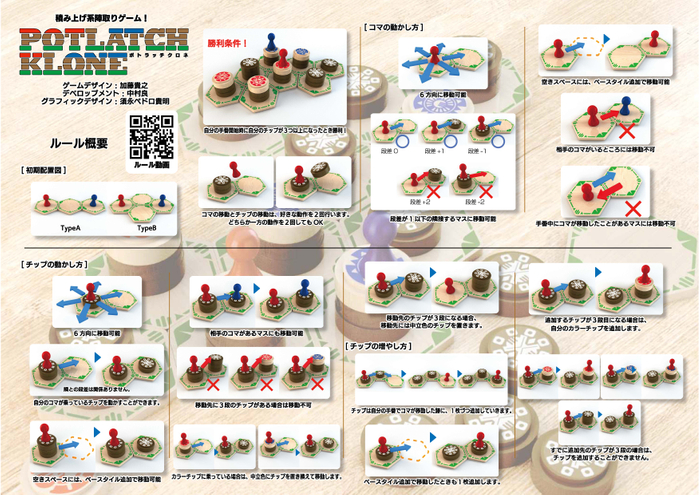 『POTLATCH KLONE』はコマとチップのどちらを動かすか?という選択を繰り返すだけの簡単なルールながら、先々を読む楽しさが十分に味わえる積み上げ系陣取りゲームです。