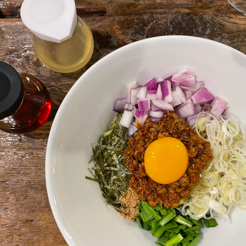 店主けんとの地元大分のブランド牛「豊後牛」をはじめ、一般のラーメン店ではなかなか導入が難しい厳選素材を使用しました。大きくて綺麗な卵黄の卵は長崎から、ニラは高知の農家から直接、ジューシーな玉ねぎは北海道から、麺は三河屋製麺から特注にて取り寄せてます。途中、大分のかぼす酢をかけて更に美味しくお召し上がり下さい。完成度の高さに驚かれると思います。