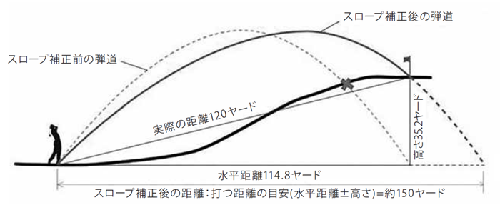 コースの傾斜に応じて実際に打つべき距離の目安を表示します。高低差があり距離感がつかみにくい時にも、クラブ選択を的確にアシストします。