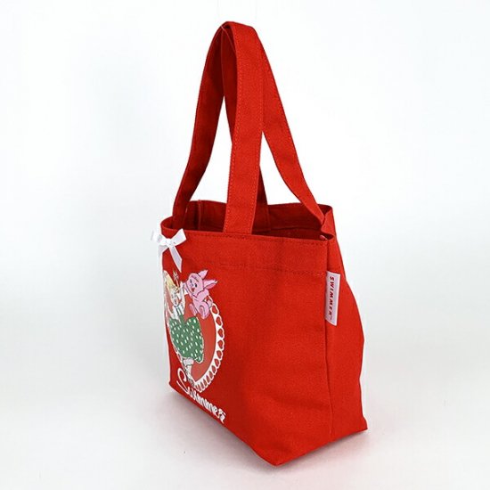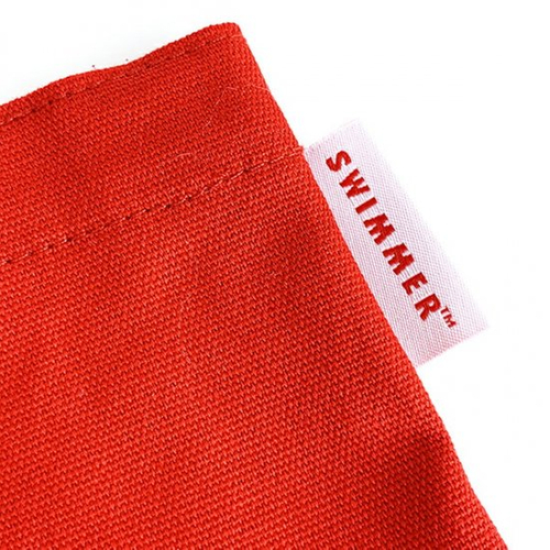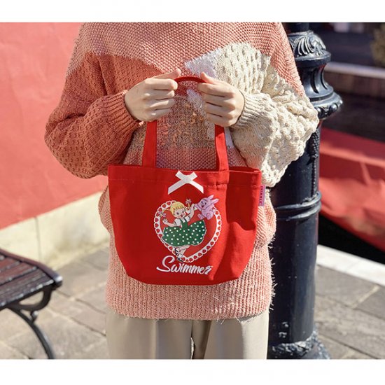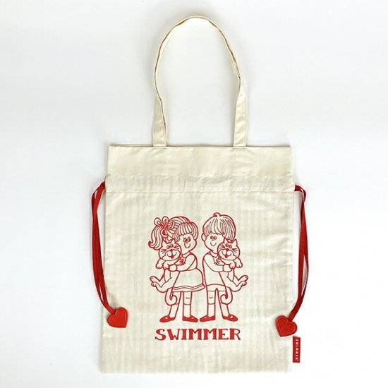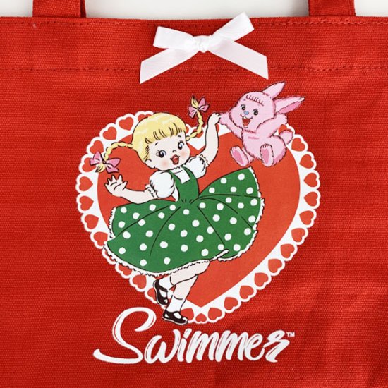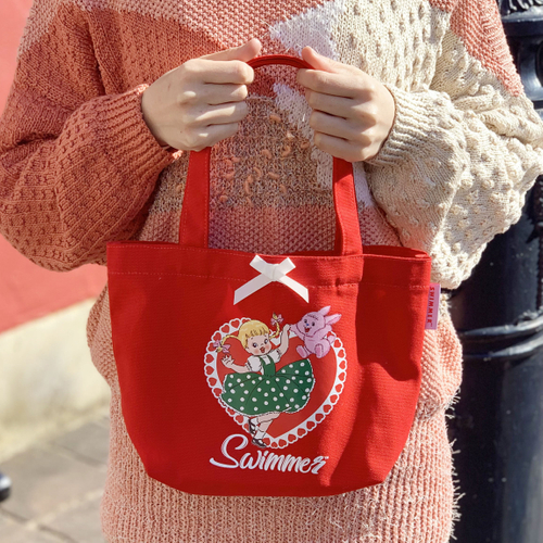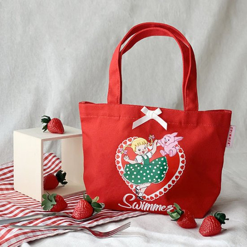 今日はその中から、キュートな赤いランチトートバッグのご紹介です。復活したスイマーの代表的なデザインとしてもお馴染みで、いたるところにSWIMMERの魅力が散りばめられています。