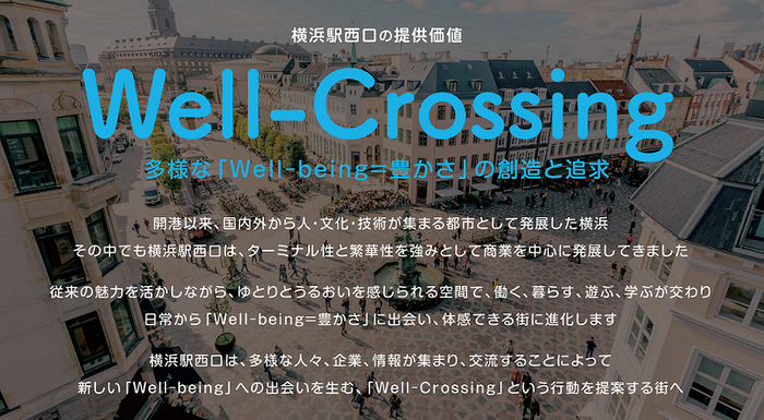 横浜駅西口の魅力にWell-beingの要素をプラスした、「Well-Crossing」というコンセプトを標ぼうしてまちづくりを進めます。