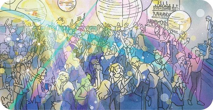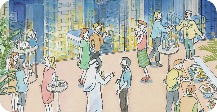 国際的なシンポジウムののち、アフターパーティーを開催。多国籍のビジネスパーソンが意気投合し、新たなコンテンツの作戦を話し合っています。
