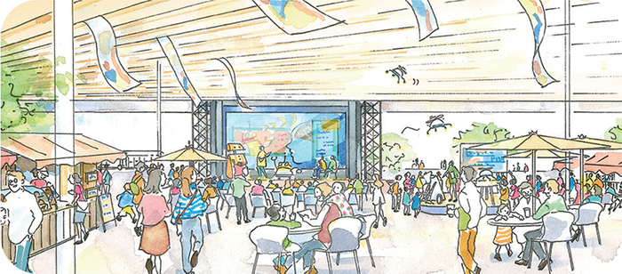 水辺のひろば周辺では歩行者空間が広がり、にぎわいの中にゆとり・うるおいが生まれました。ひろば・ストリート一体でオープンマーケットが開かれ、地元の家族連れや観光客が入り混じって、楽しく食事をしています。