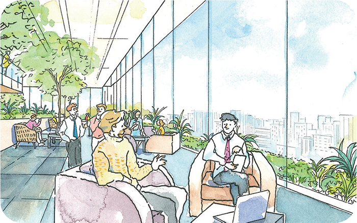 横浜のまちや港が一望できるサービスアパートメントのラウンジで、滞在中のビジネスパーソンたちが次のビジネスに向けたアイデアをあれこれと話しています。