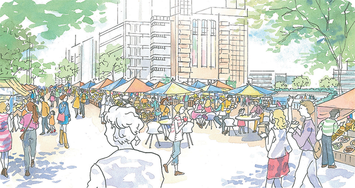 公共空間の整備においては、「エキサイトよこはま22」における西口駅前空間のコンセプトである「HUMAN ENERGY CORE(ヒューマンエナジーコア)」を踏まえ、人が集いまちの回遊の拠点となる「ひとにやさしい空間」づくりを横浜市と連携して進める計画です。人が心地よく集い過ごせる駅前空間と、安全を確保したうえであらゆる人が利活用できる親水空間を創造すると共に、安全で歩きやすい歩行者優先のウォーカブルなまちづくりを目指します。