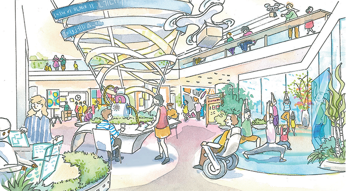 アトリウム内の体験ラボでは、住民やインバウンド観光客がWell-beingサービスを体験しています。ここでは、ロボットやサイネージが横浜での楽しい1日の過ごし方を提案したり、バーチャルレッスンが開講されたり、最新技術を活用して皆が気軽に趣味や楽しみを見つけられる場になっています。