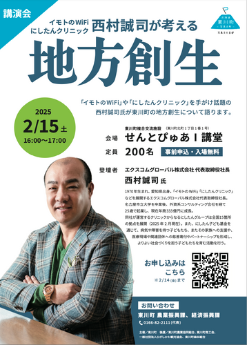 北海道 東川町は、「イモトのWiFi」や「にしたんクリニック」などを展開するエクスコムグローバル㈱ 代表取締役社長 西村誠司氏が東川町に来町し、東川町の地方創生について語る講演会を「西村誠司が考える地方創生」と題して2月15日に開催します。