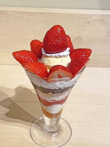 「白バラ」のアイスやヨーグルト、「とってお き」、鳥取県産のブルーベリーやいちじくを使ったフルーツソース、鳥取県オリジナル米「星空舞」ポン菓子など、鳥取の魅力たっぷりのパフェです。