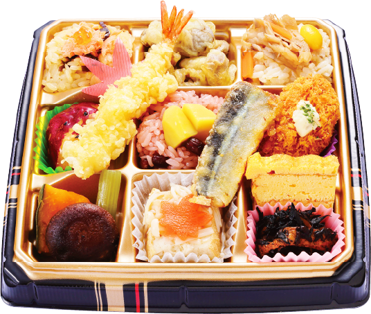 なめこ・えのき・椎茸・舞茸・カキ・さんま・かぼちゃ・さつまいも・くり・銀杏など秋の味覚が1度に味わえます。9マスの容器を使用することで、さまざまなおかずやごはんを少しずつお召し上がりいただける贅沢な御膳に仕上げました。