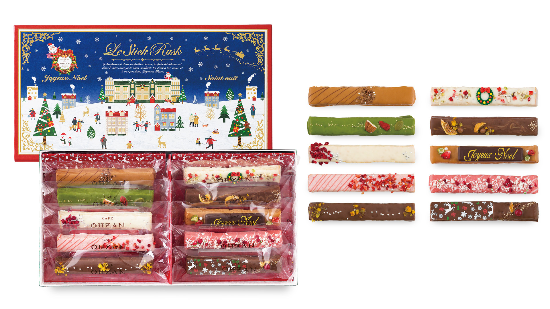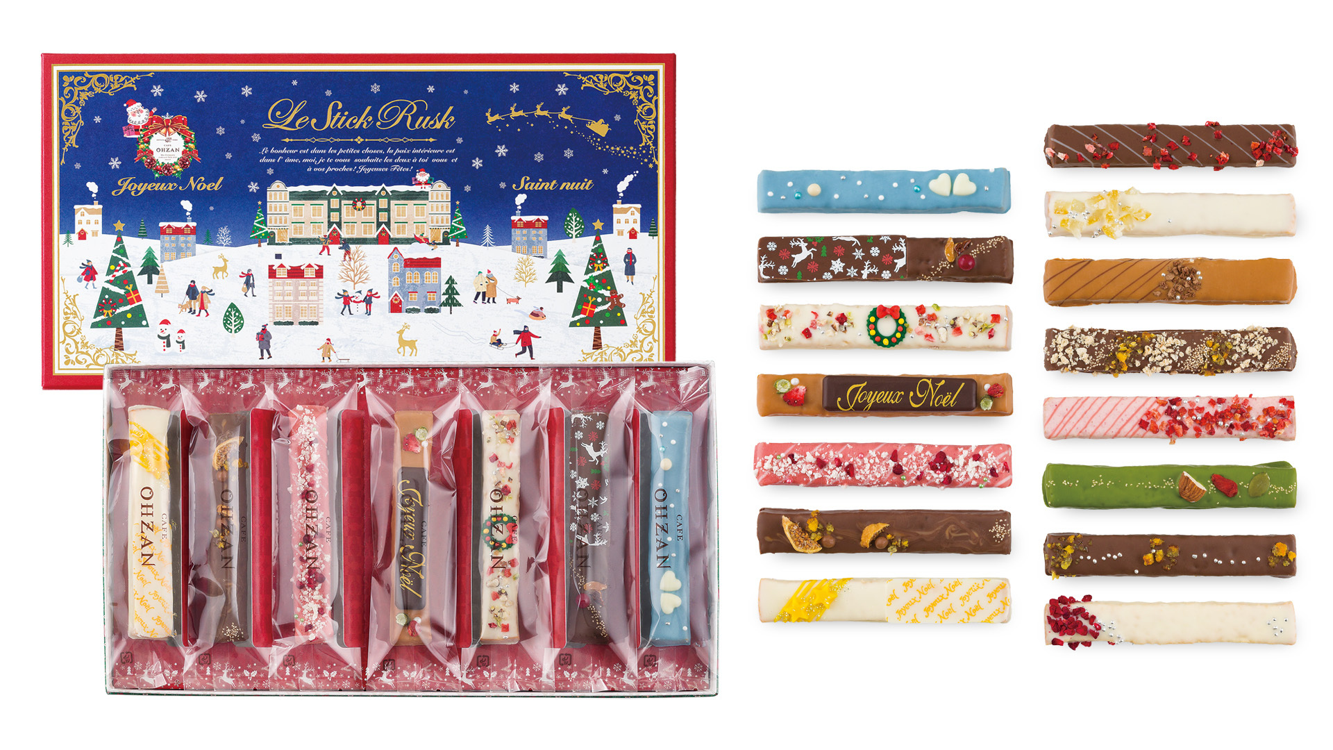 CAFE OHZANが毎年発売している、クリスマス限定パッケージのチョコレートラスクです。パッケージ・中身のラスク共に、今年だけの限定商品になります。