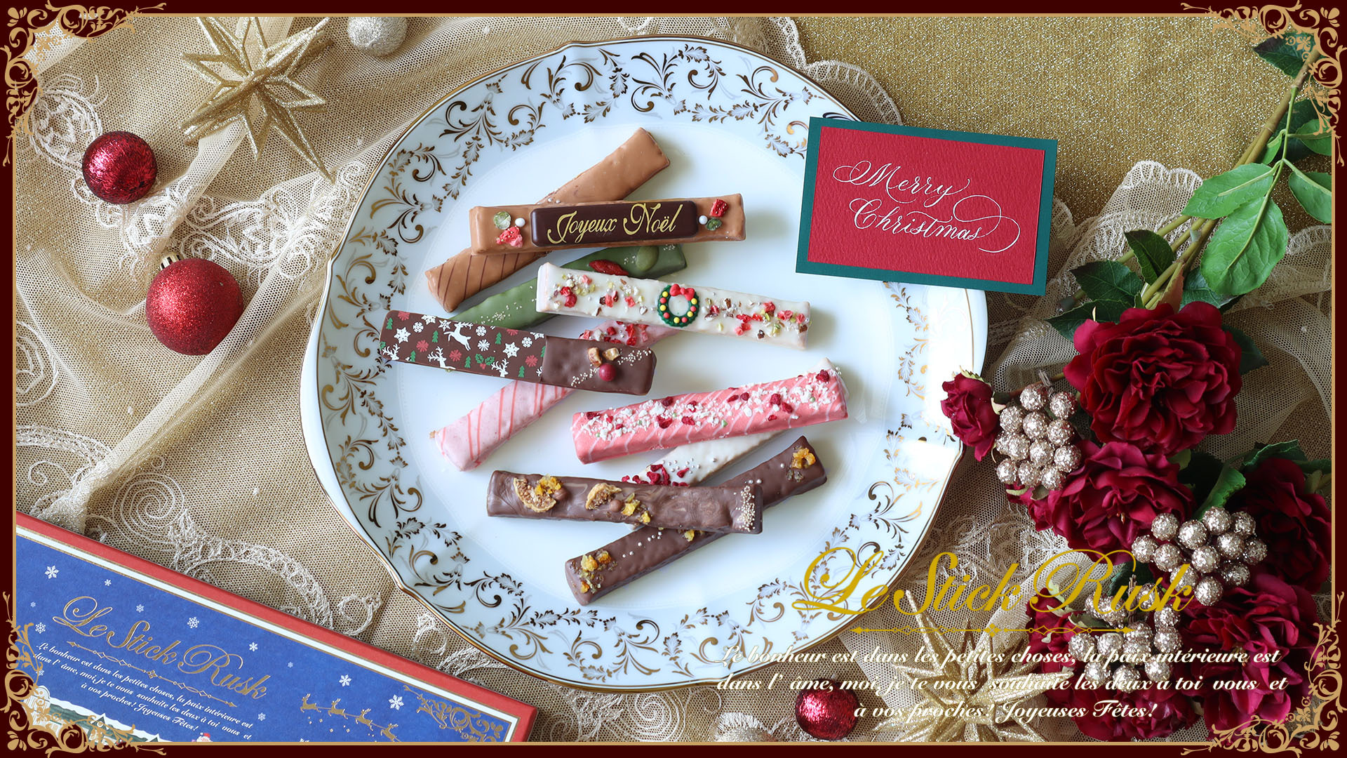 ラスクのデザインも、すべてクリスマスをイメージしています。チョコレートプレートに描かれた「Joyeux Noel」は、フランス語で「メリークリスマス」の意味。一目でシーズン感が伝わる、この季節にぴったりのギフトです。