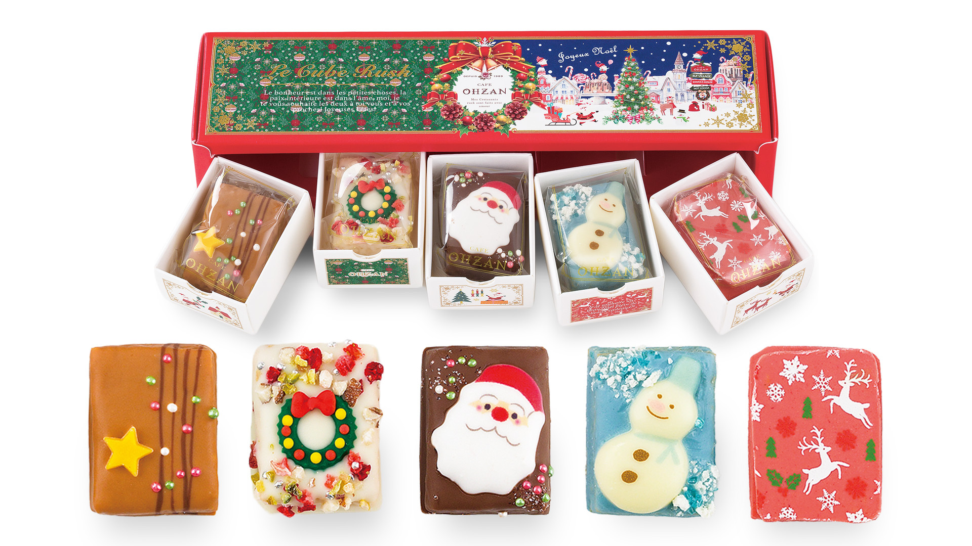 スター、クリスマスリース、サンタクロース、雪だるま、そしてトナカイと、クリスマスアイコンを贅沢にあしらったラインナップです!