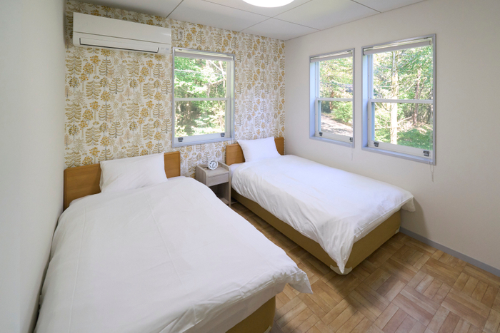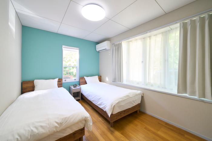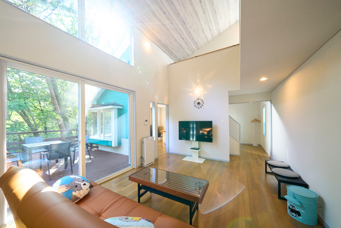 当施設は鮮やかなグリーンが特徴的な外観で、オープンにあたりウッドデッキ、駐車場を拡充、内装をリニューアルし、家具・家電も新調されています。ダイニングには大きな出窓が設置されており日差しが燦燦とさしこみます。リビングは、吹き抜けの高い天井と大きな窓が開放感を演出し、家族そろっての団欒のひとときが過ごせます。さらに、リビングとデッキテラスが繋がっており、周囲に広がる落ち着いた自然の中で森林浴やアウトドア感覚でのお食事を愛犬と共に楽しむこともできます。また、寝室は3部屋(シングルベッド×2・シングルベッド×2・布団×4)で、最大で8名様までご利用いただけます。