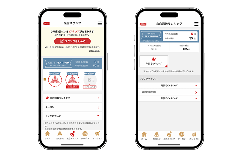 リニューアルにより、月次更新のスタンプカードが導入され、台紙にスタンプが貯まっていくようなデザインに一新しました。会員ランクが4段階用意されており、来店回数に応じてクーポンが配布されます。来店時に、店舗にある“二次元コード”をアプリで読み取り、1回の来店につき1スタンプを獲得することができます。