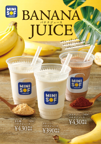 ミニストップ株式会社(本社:千葉県千葉市 代表取締役社長:藤本 明裕、以下:ミニストップ)は、 1980年の創業より販売を開始した「ソフトクリーム」の専門店「MINI SOF(ミニソフ)」(2021年5月現在:14店)にて、人気のバナナジュースにフレーバーをプラスした新商品「きな粉バナナジュース」と「ココアバナナジュース」(各税込430円)を、6月18日(金)より発売いたします。MINI SOFでは今後も、MINI SOFでしか体験できない本格的なおいしさと、ひと時の幸せをお届けいたします。