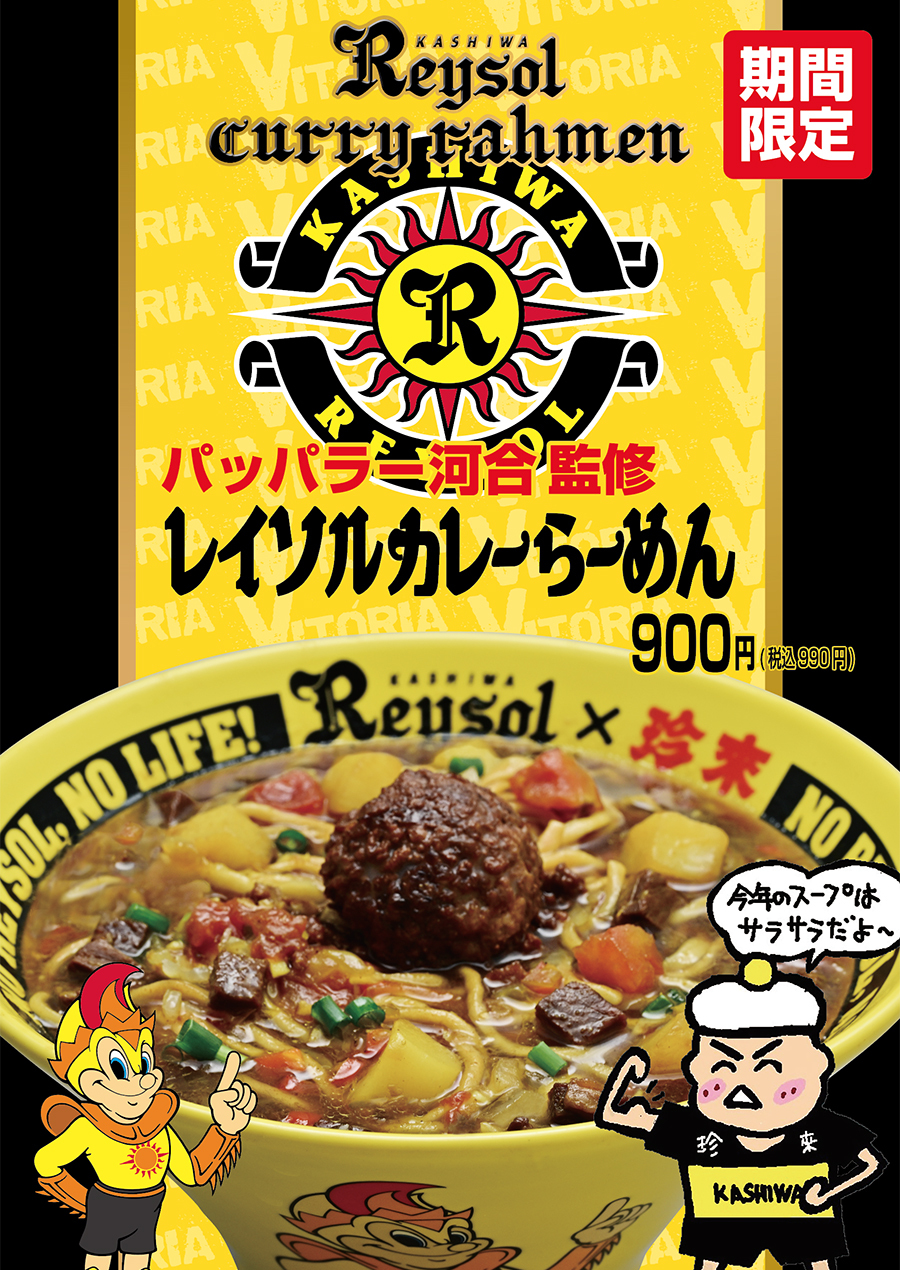 今シーズンの「パッパラー河合監修レイソルカレーらーめん」は、Jリーグホーム開幕戦の2月22日(土)よりスタジアム隣接する「珍來柏日立台店」と「珍來柏東口店」の2店舗で先行発売したところ、昨年対比200%出数で初日をスタート、以降も連日昨年出数を大幅に超え、ソーシャルメディアでも話題の商品大反響となっています。
