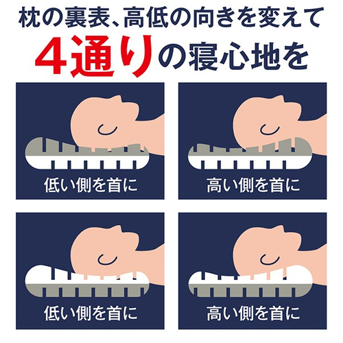 快眠を求めて枕の需要は高まっているが実際に寝てみないと自分にあっているか分からないという悩みも多い。そこで弊社の枕は4通りで使用できる表は低反発.裏は高反発の素材を変えた枕を提案します。