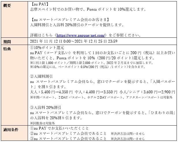 KDDIは2021年11月12日から2021年12月25日までの間、「志摩スペイン村」において、au PAY利用で10%のPontaポイント還元や、auスマートパスプレミアム会員のお客さまを対象に入園料割引や入浴料20%割引を提供するおトクなキャンペーンを開催します。