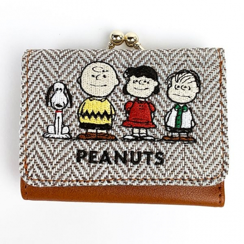 スヌーピーがチャーリーブラウンやルーシー、ライナスと並んでいるデザインの、コンパクト財布です。