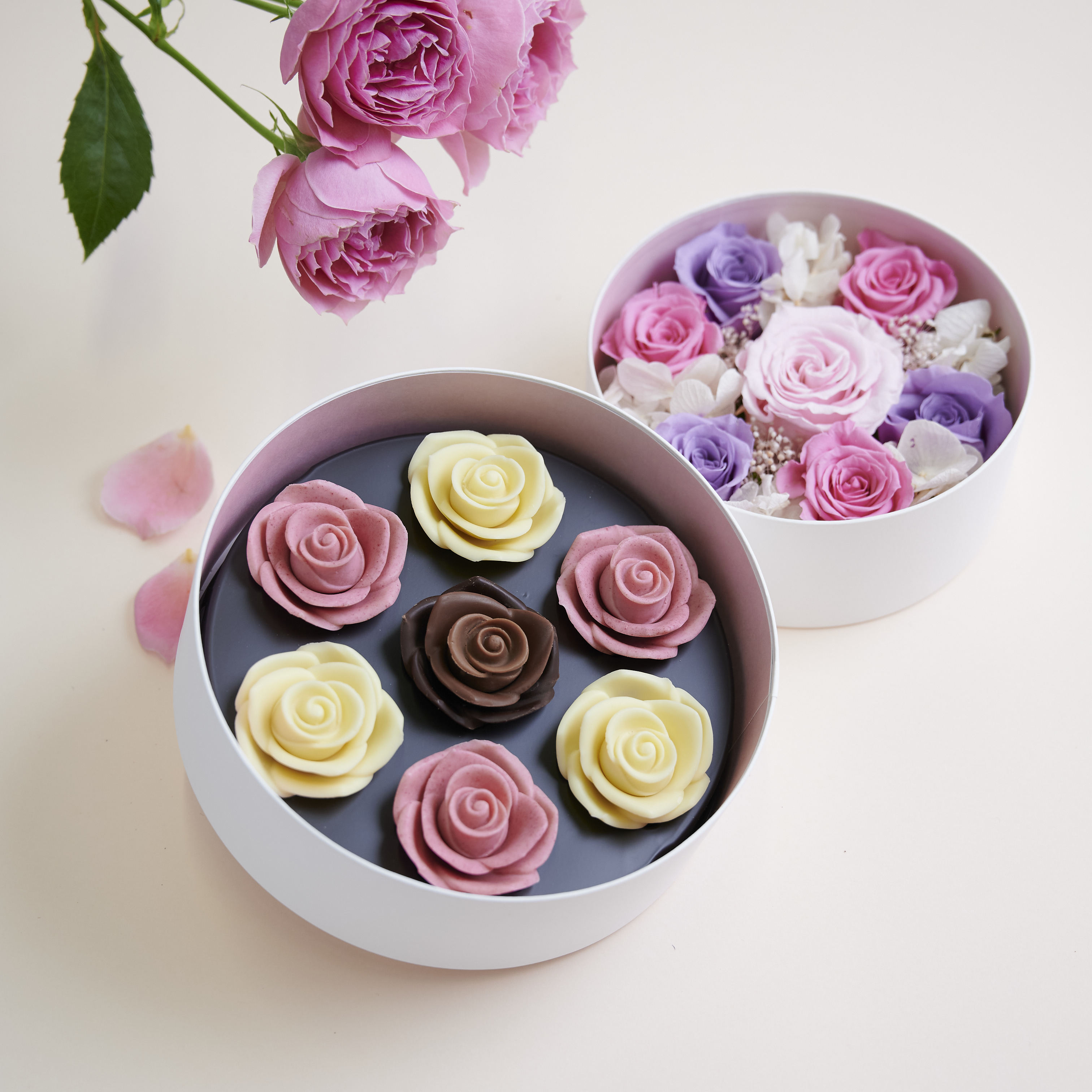 薔薇をブーケに仕立てた、透明感と気品のあるショコラボックスと薔薇のプリザーブドフラワーが2段セットになったフラワーギフトボックス。