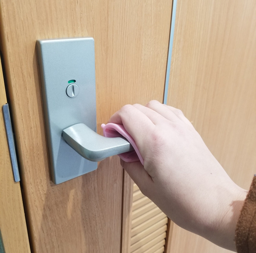 棒状のドアノブならばNewGripPon(グリッポン)が使用可能。突起部分でエレベーターのボタンや電気のスイッチなどのプッシュ式ボタンも直接触らず押すことができます。