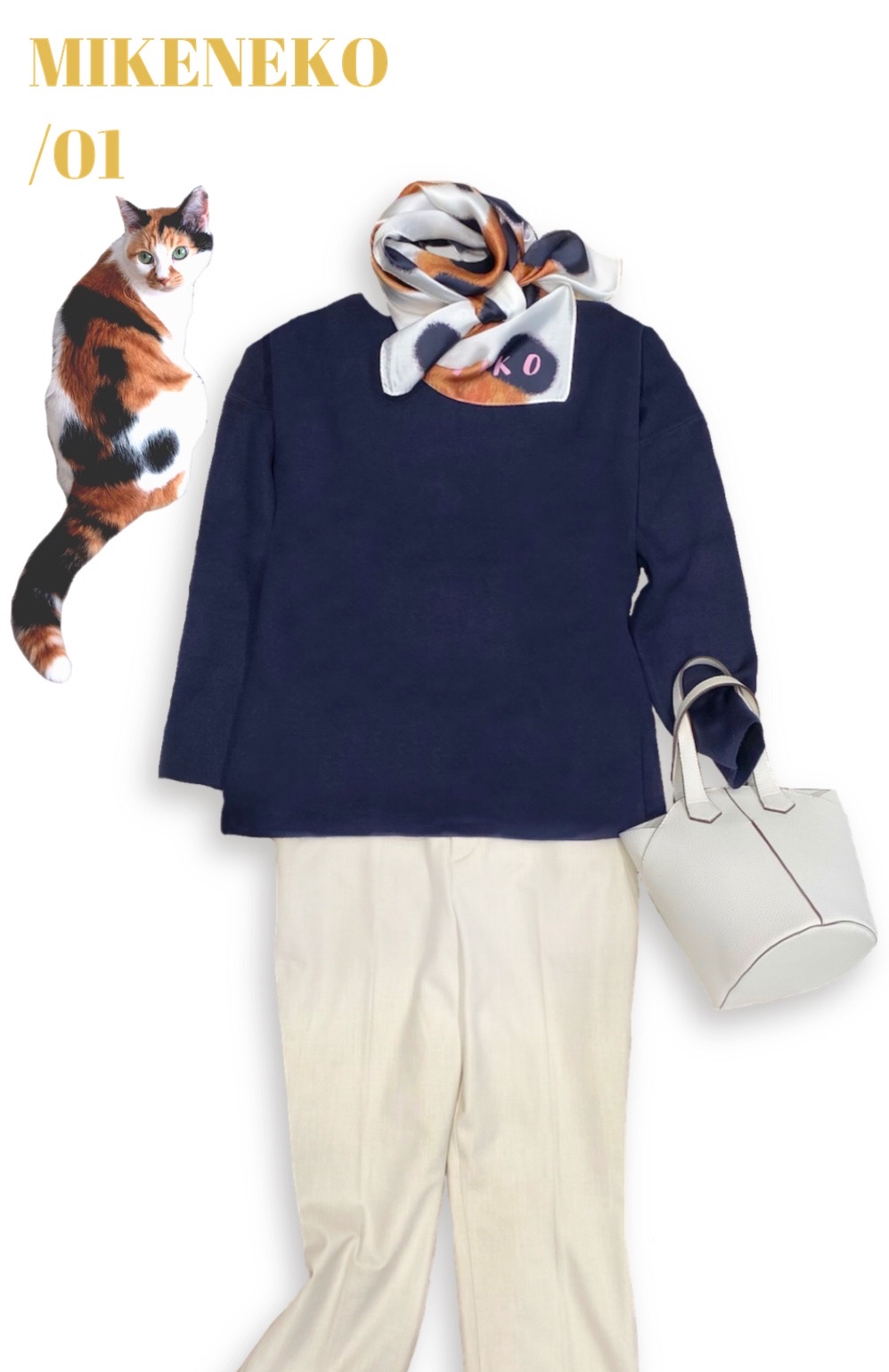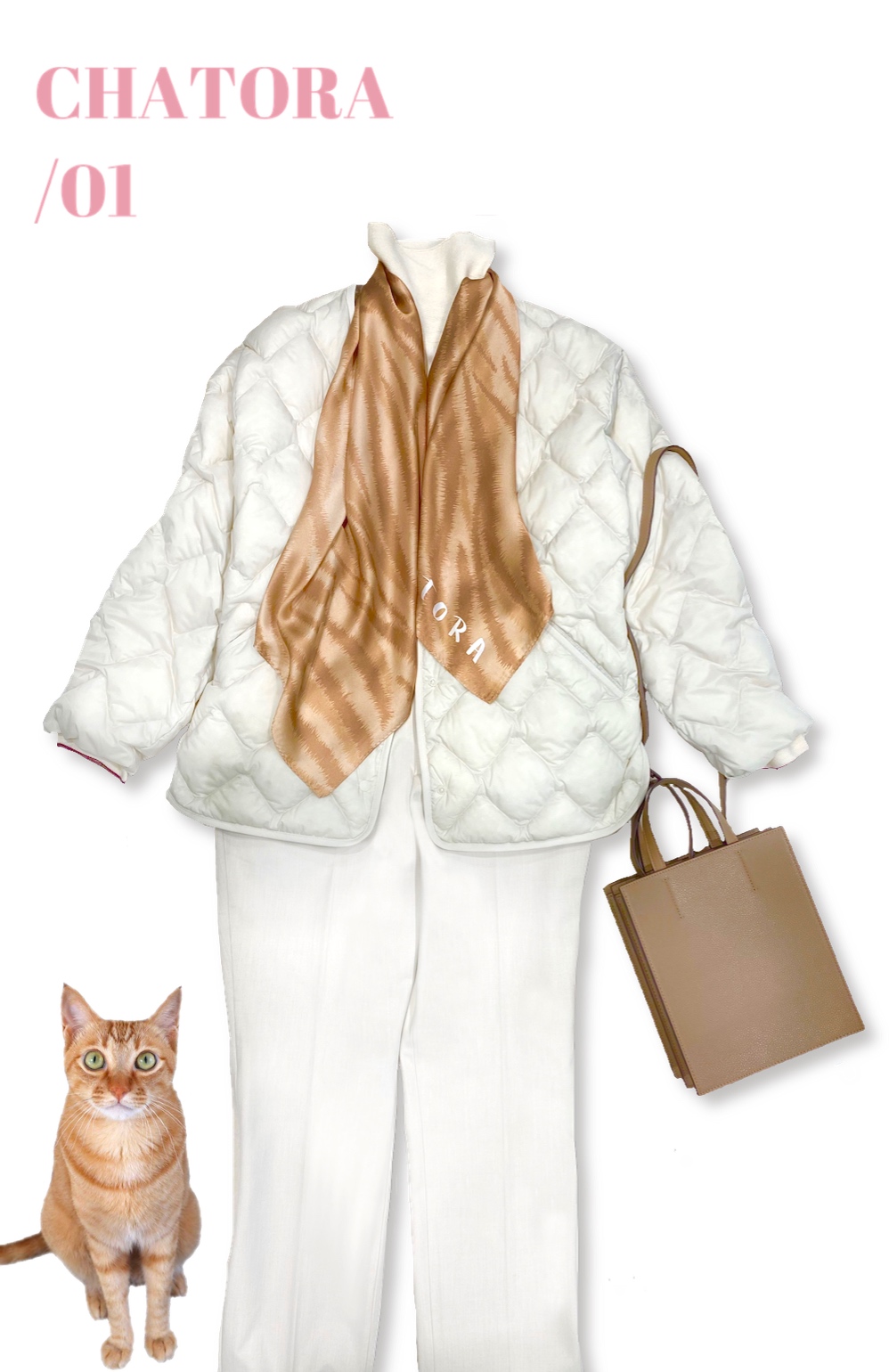 シンプルなデザインのトップスにはスヌードスタイルで茶トラ柄を主役に。