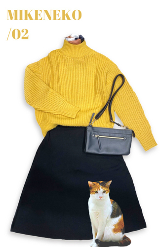 この冬トレンドのイエローには三毛猫柄をちょい見せで可愛らしく上品に。
